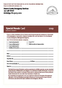 Every year Borough residents receive an Emergency Preparedness Information brochure in the mail from Beaver County Emergency Services. This brochure contains important Emergency Planning information to be used in the unlikely event of an emergency at Beaver Valley Power Station and for other types of emergencies. Enclosed in the brochure are Special Needs Cards. These cards are very important in helping Emergency Management assist you should an emergency occur. The card is for those who would need special help during an emergency because of physical impairment or special medical problems. Every year you should fill out this card if it applies to you and return it to Beaver County Emergency Services. The information is compiled by the County and forwarded to Beaver Borough Emergency Management. The information is kept confidential and only used during emergencies. If you care for a family member who has special needs, please assist them with filling out this card. These cards must be submitted annually in order to have up to date information. The brochure and special needs cards can be printed at www.beavercountypa.gov.