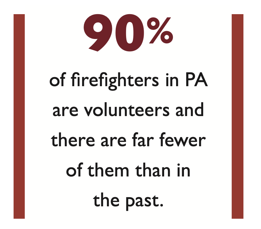 Today, over 70% of the fire departments in the U.S. are manned by volunteer firefighters. Ninety percent of firefighters in PA are volunteers and there are far fewer of them than in the past. There were more than 300,000 volunteer firefighters in PA in the 1970’s. Today, there are about 38,000.