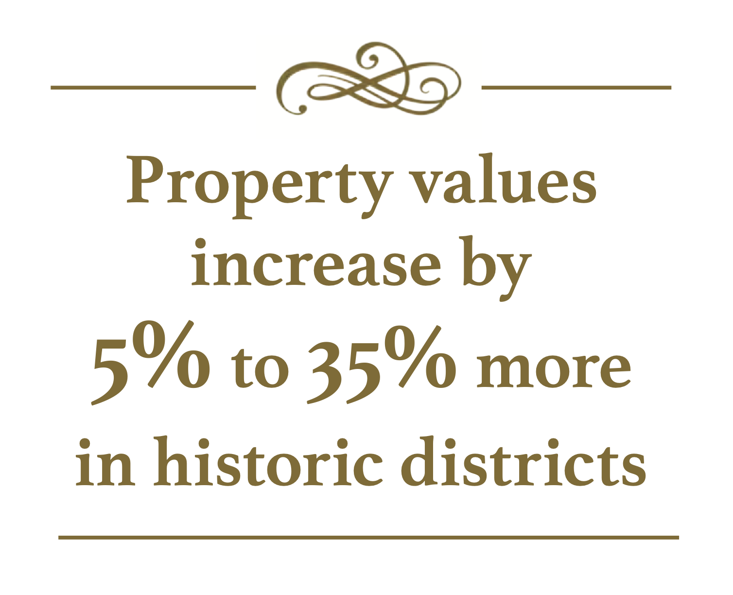 • Historic district designation typically increases residential property values by 5-35% per decade over the values in similar, undesignated neighborhoods.